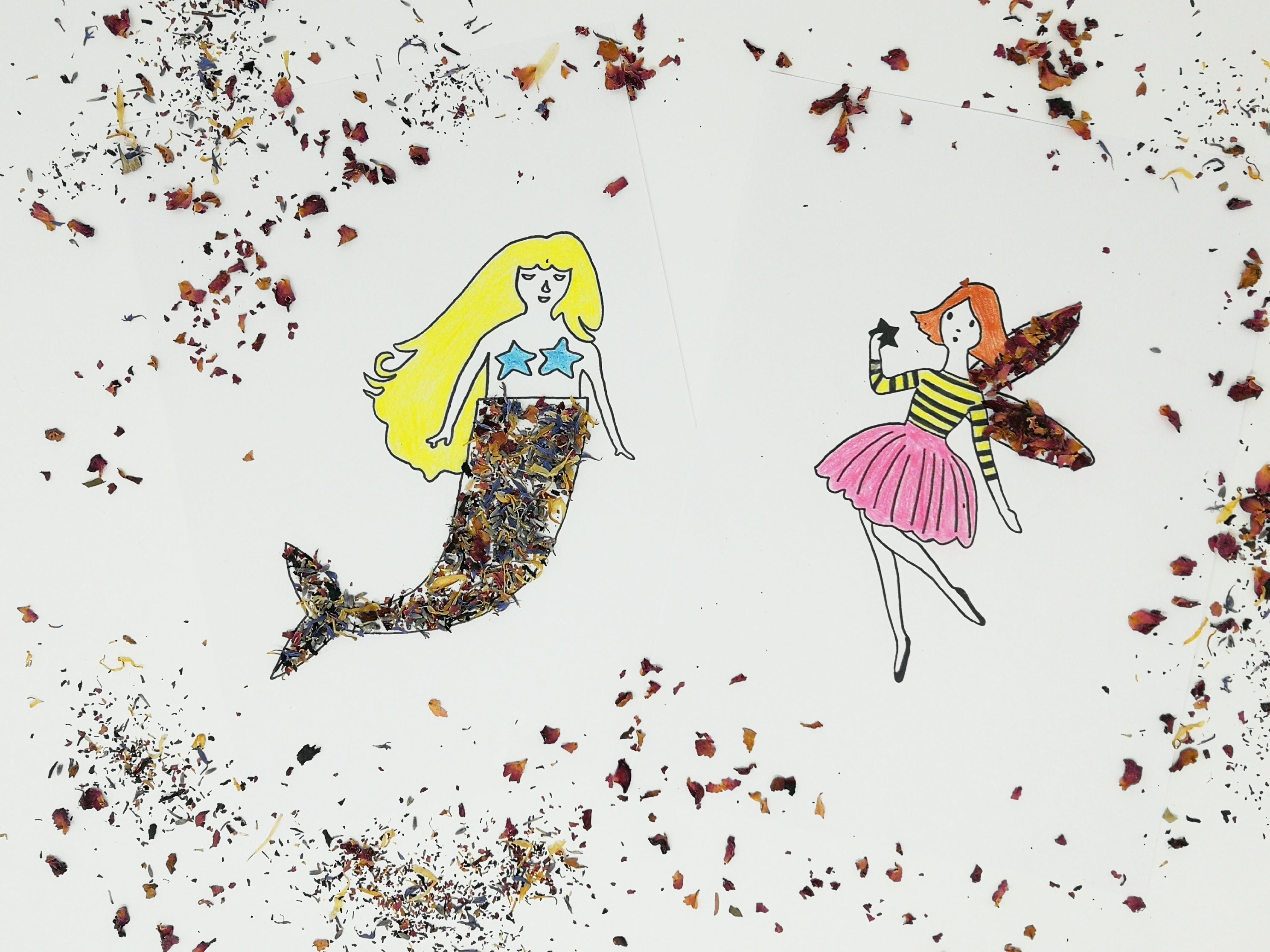 Dann die Flächen, die beklebt werden sollen mit dem Klebestift einstreichen und anschließend die Blüten oder Gewürze darüber streuen.