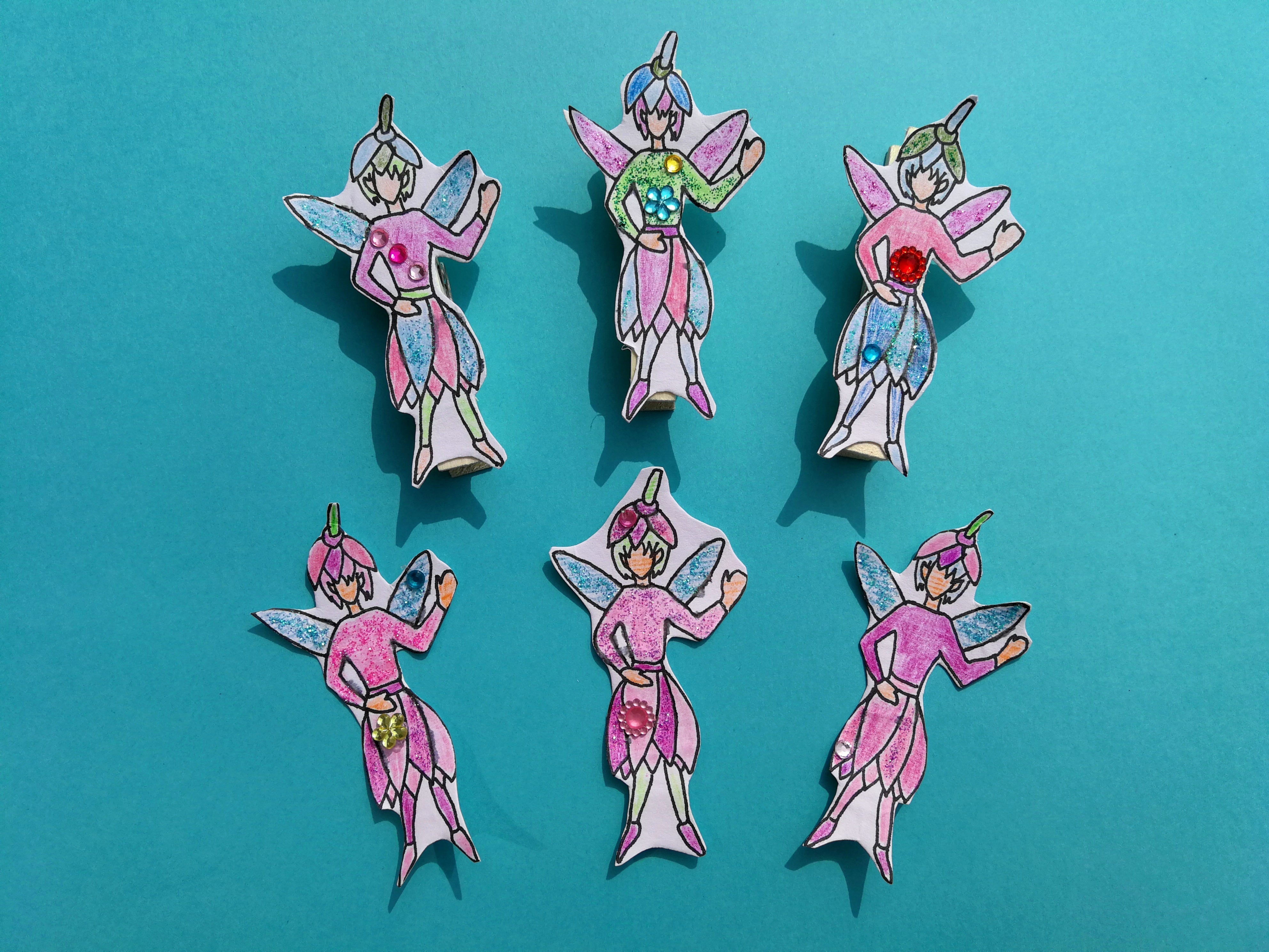Wenn alle Elfen fertig sind und die Gäste sich über das Elfenbuffet her machen, kannst du die Elfen auf die Wäscheklammern kleben, z.B. mit Heißkleber (bei einfachem Kleber können das die Gäste auch selber). Wenn der Kleber trocken ist, kommen die Elfen in die Mitgebseltüte und eure kleinen Partyelfen haben eine schöne Erinnerung an das Fest.