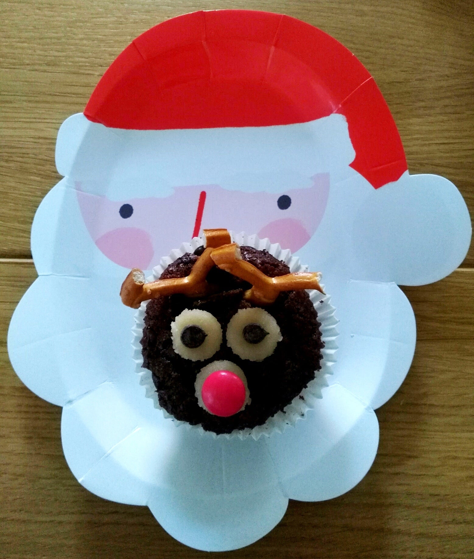 Die Brezeln werden durchgebrochen und als Geweih in den Muffin gesteckt. Alles andere wird mit ein wenig Zuckerguss auf dem Muffin befestigt.