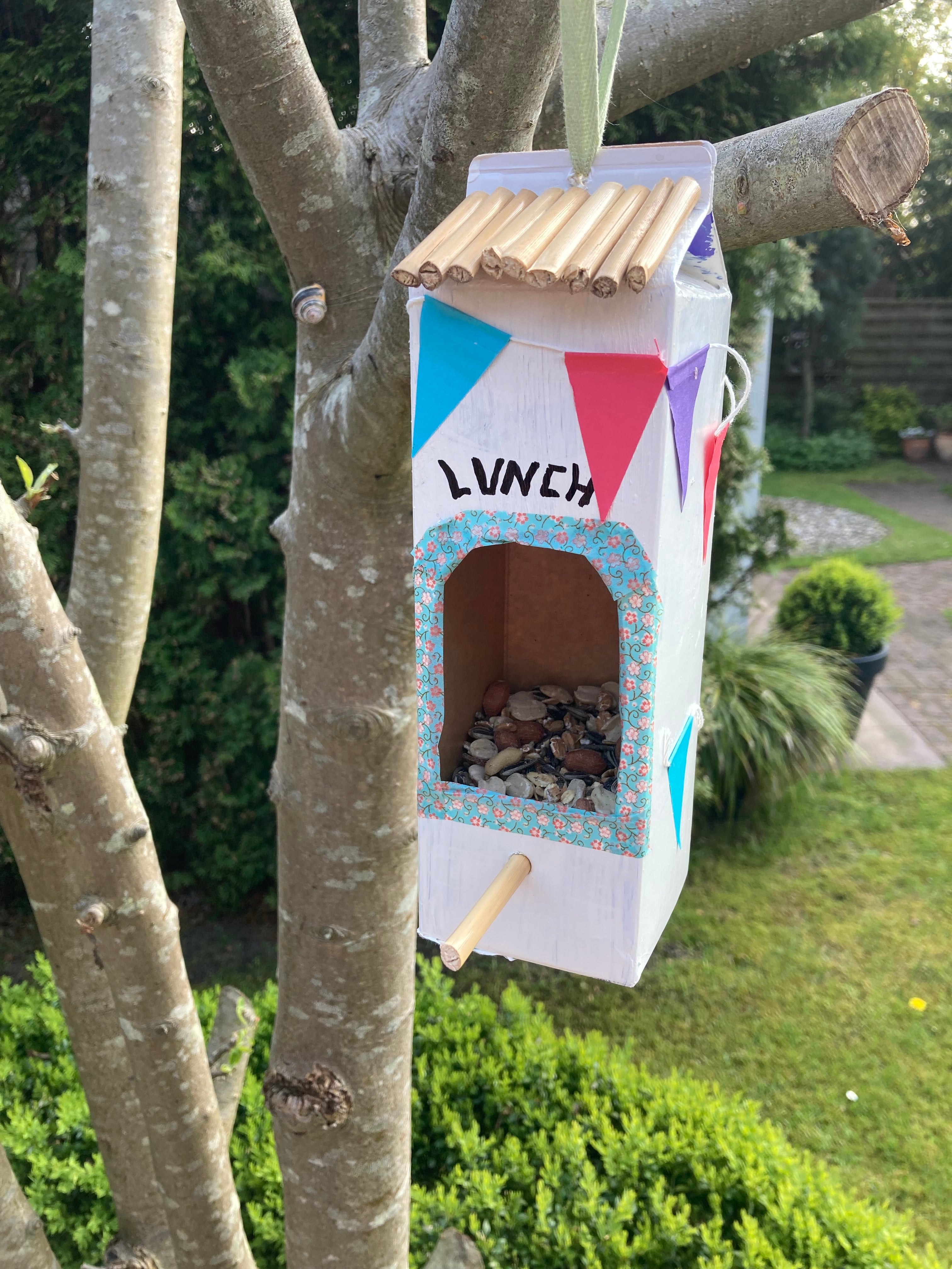 Zum Schluss befüllt ihr es mit Vogelfutter und befestigt ein Aufhängeband daran – fertig ist das neue Restaurant für eure Lieblingsvögel.