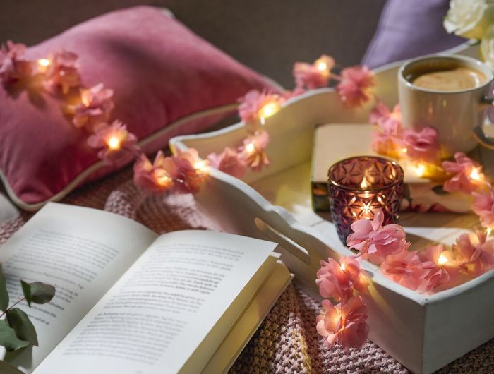 Lichterkette mit Blüten aus Stoff und 20 warmweißen LEDs. Mit USB-C-Anschluss, Betrieb per USB-C-Kabel (Batterien - 3 x AA und Ladekabel nicht enthalten) oder Batterien (mit Deko-Hülle für das Batteriefach) Für den Innenbereich geeignet. Mit dieser Lichterkette verwandelt ihr euren Partytisch in eine magisch, stilvolle Welt.