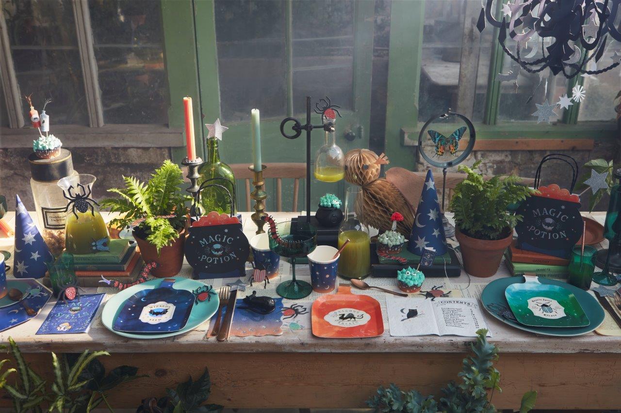 Magic ist das spezielle Partymotto für kleine Zauberer und Hexen (und auch fantasiebegeisterte Erwachsene!). Diese ganz besondere, glitzernde Girlande basiert auf der Herstellung und den Zutaten eines Zaubertranks. Die erste Girlande zeigt die Worte „Make Magic“ mit silberner holografischer Folie und Sternen, die mit silbernem Glitzer bedeckt sind. Die zweite Girlande zeigt einen Kessel, einen Pilz, einen Käfer und Augäpfel mit Wabendetails; einen Mond und Sterne aus silbernem Glitzer; Zaubertrankflaschen mit blauem und orangefarbenem Garn und eine mystische 3D-Eule. Die Girlanden werden an einer silbernen Kordel aufgehängt. Girlandenlänge ca.1,7 m, Kordellänge ca.2,9 m