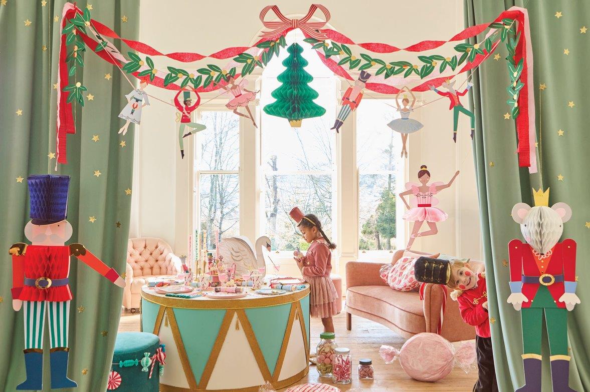 Beeindruckende Girlande für eine Ballett- oder weihnachtliche Nußknackerparty. Zauberhafte Figuren zeigen sich umringt von langen, rosa- und rotfarbenen Bändern und einer Blättergirlande. Die Mitte ziert ein großer Wabenball in Form einer Baumes, Wunderschöne Deko für den Eingang des festlichen Raumes oder an der Wand (auch als Fotohintergrund sehr schön):