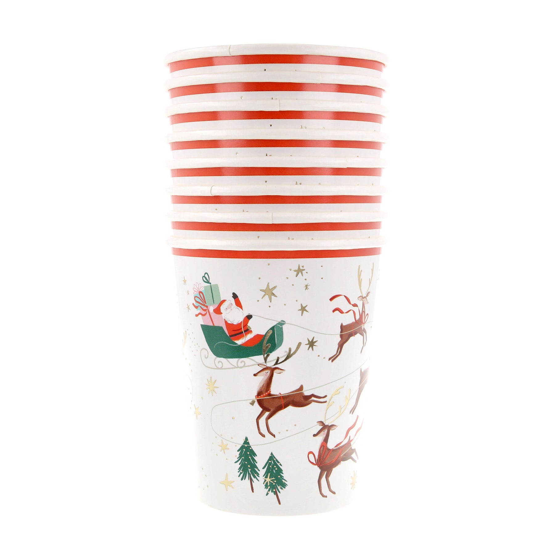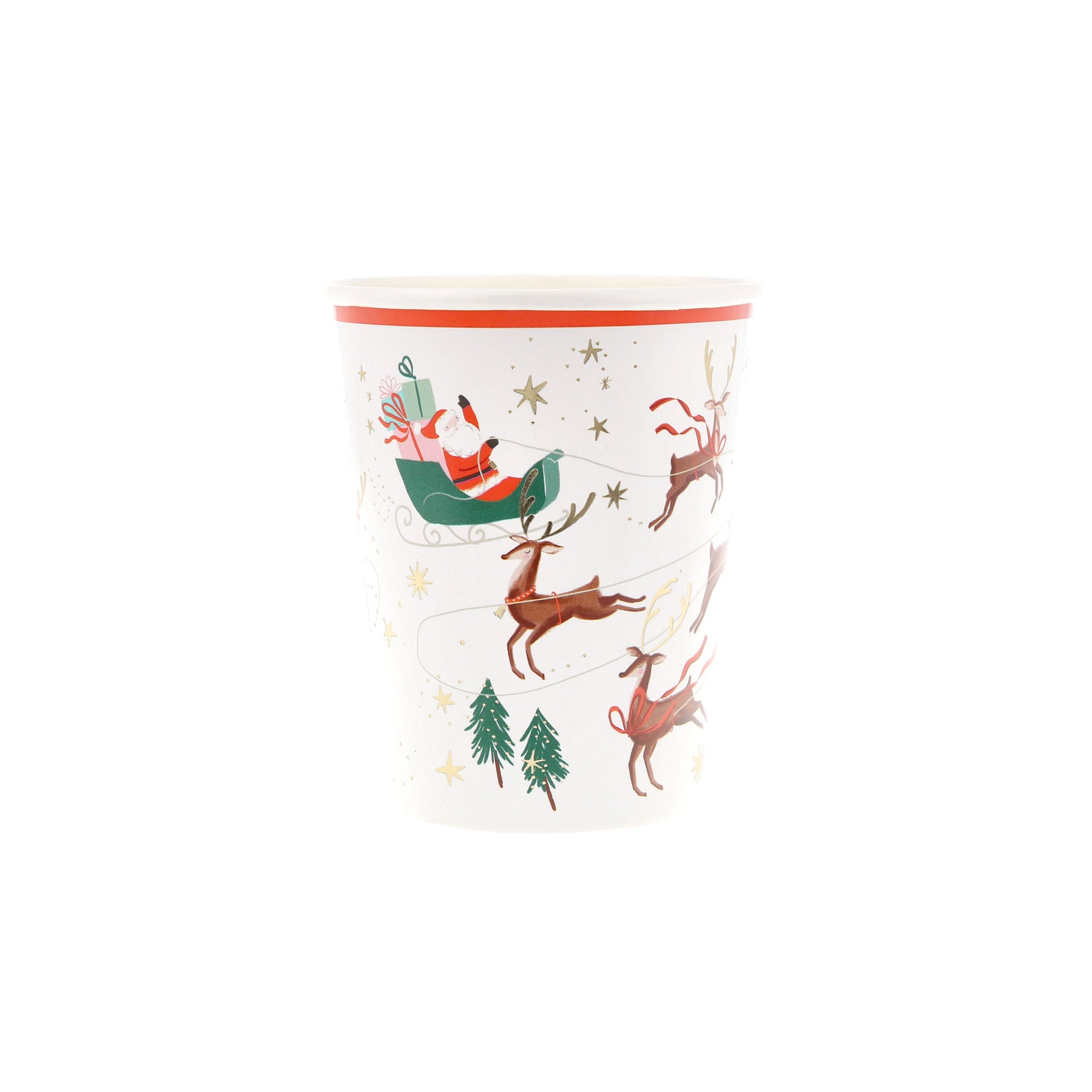Diese Becher haben das Motiv eines schlittenfahrenden Weihnachtsmannes, gezogen von fröhlichen Rentieren. Der Rand ist abgegrenzt mit einem roten Streifen. Genau das Richtige für einen weihnachtlichen Nachmittag, zum Frühstück mit Freunden oder für Getränke beim Grillen im Advent.. Für kalte und heiße Getränke geeignet. Anzahl:8 Stück