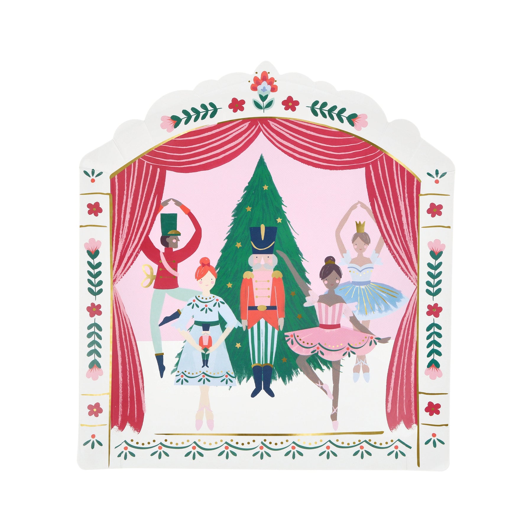 Diese Teller in Form einer Theaterbühne mit dem Motiv der Nußknackeraufführung, umringt von roten Bühnenvorhängen. Tanzende Ballerinas und ein Nußknacker zeigen ihre Schönheit.