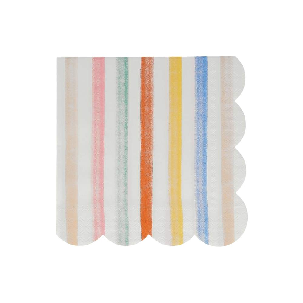 16 Servietten in drei verschiedenen Ausführungen - mit bunten Quadraten, bunten Streifen und bunten Punkten. Jeweils mit einem schönen Wellenand. Passend zu fast jeder Party!