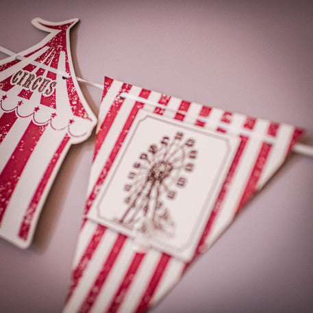 Passend zur Serie besteht diese Wimpelgirlande aus 16 Wimpeln in elfenbein und nostalgischem rot, bedruckt mit dem französischen Schriftzug für Jahrmarkt und 2 schönen Zirkuszelten.