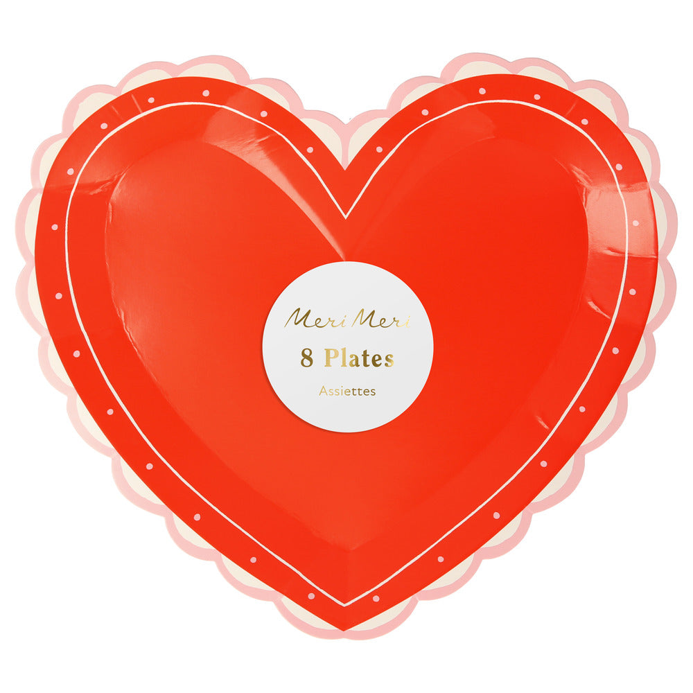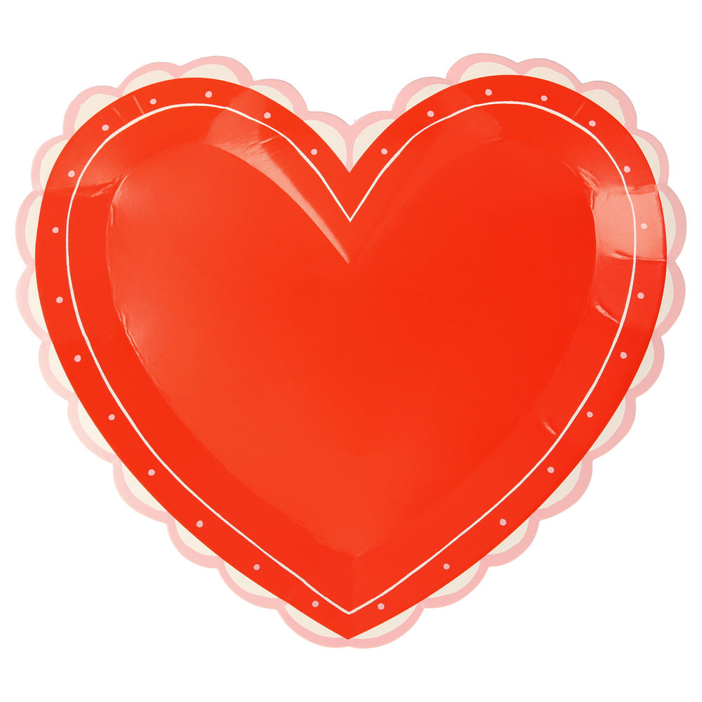8 Teller in Form eines Herzens mit Wellenrand und kleinen Punkten. 4 Teller in Rot und 4 Teller in Rosa.