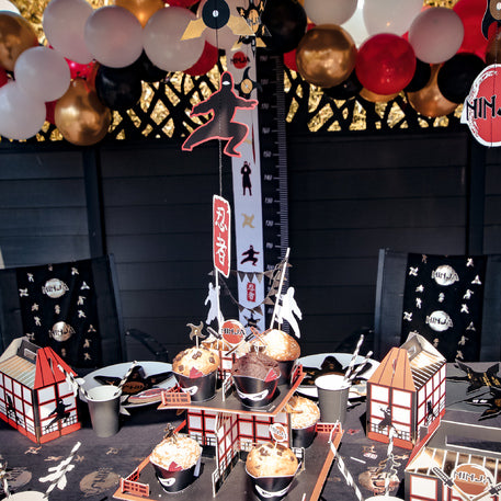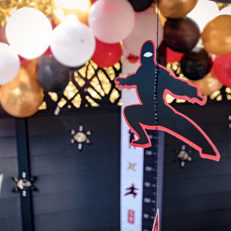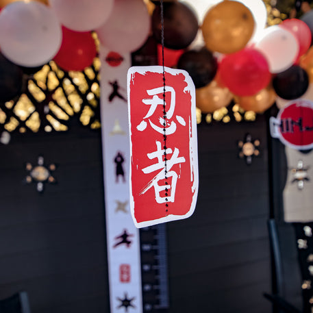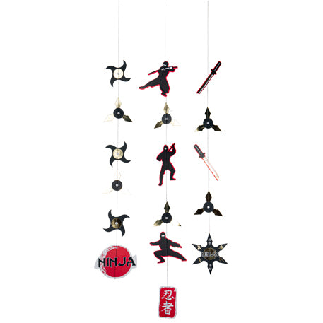 3 Hängedekorationen mit den Ninja Zeichen und vielen Ninja Kämpfern. Maße ca. 90 cm lang.