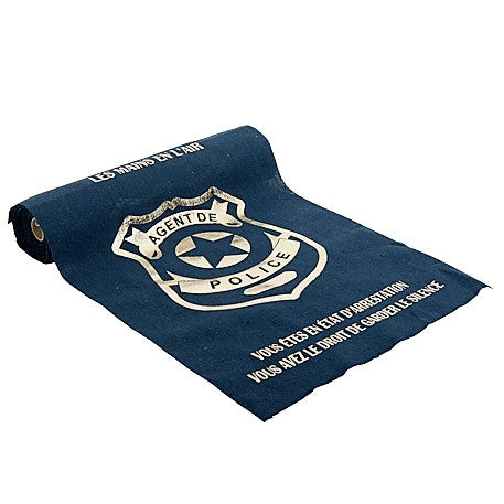 Ein Tischläufer aus Stoff mit vielen Symbolen der Polizeiwelt und goldenen Details bedruckt. Maße ca. 5 Meter x 28 cm.