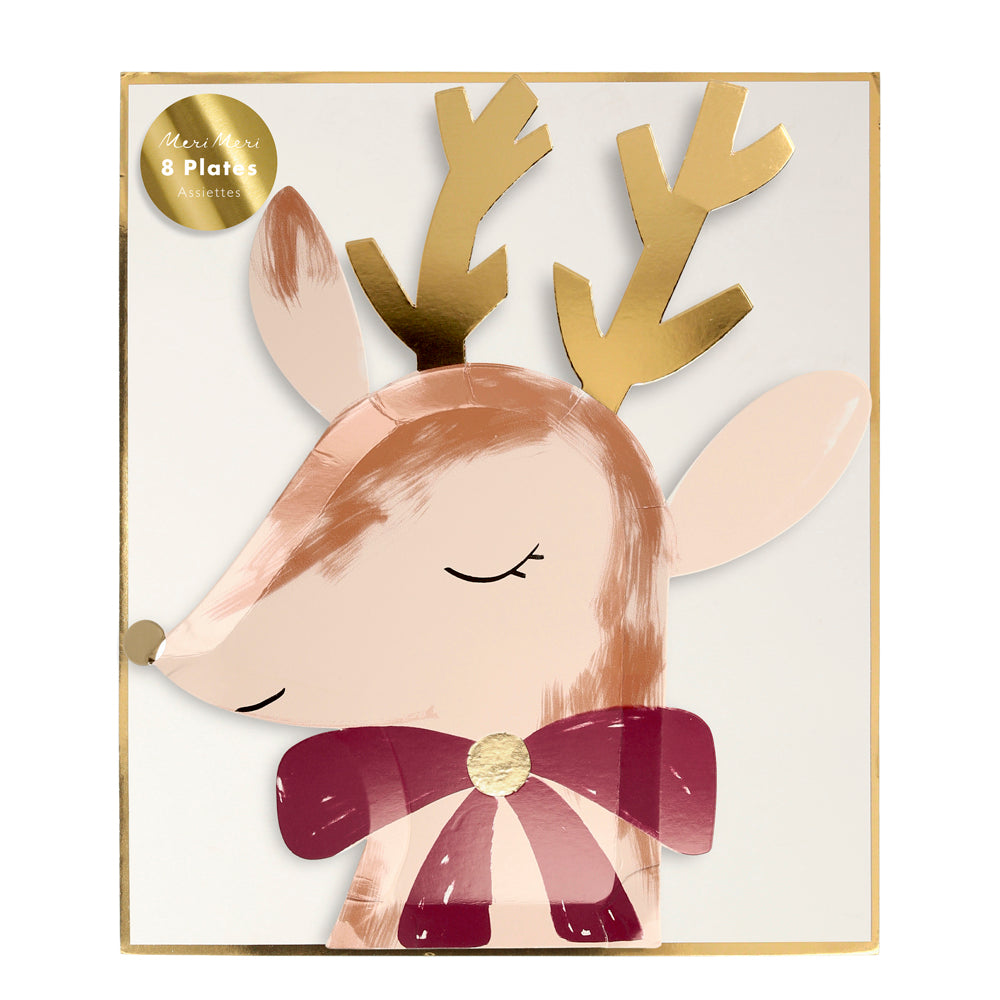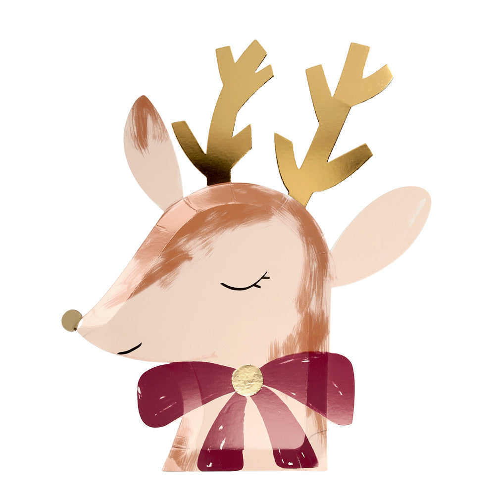 Acht Pappteller mit dem friedlichen Gesicht eines Rentieres, welches mit goldener Nase, goldenem Geweih und roter Schleife festliche Stimmung verbreitet.