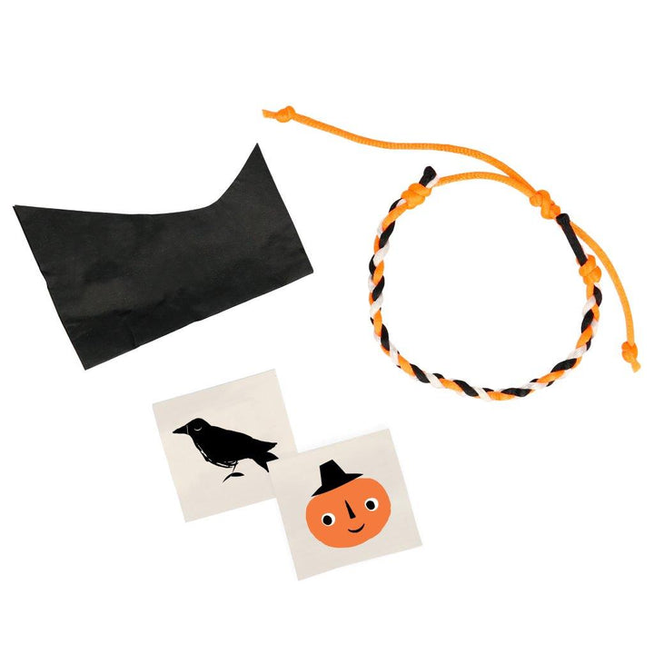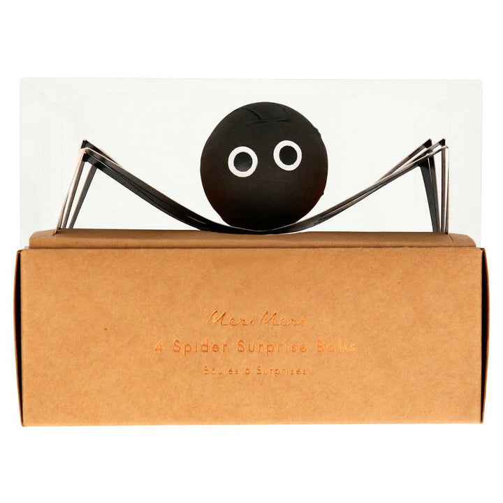 In diesen 4 gruseligen Spinnen mit glänzenden Spinnenbeinen verbirgt sich eine schöne Überraschung. Dekoriert sie auf den Tellern der Gäste und nachdem sie ausgewickelt werden, tauchen ein Tattoo, ein englischer Joke, eine Papierkrone und eine Überraschung auf.