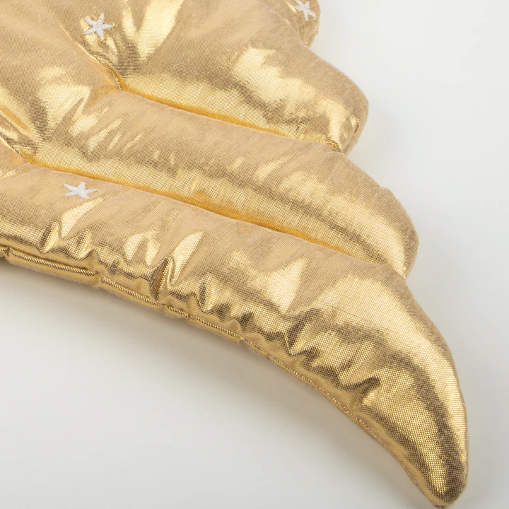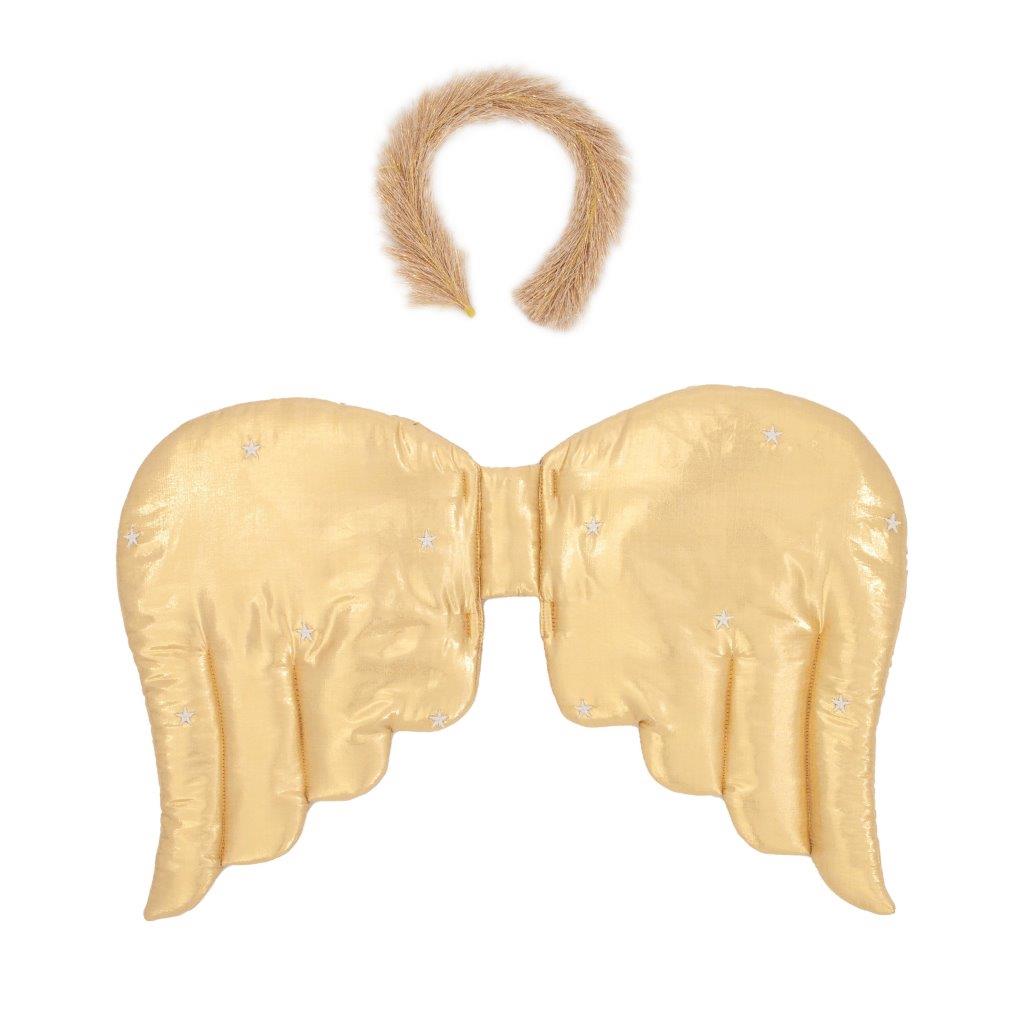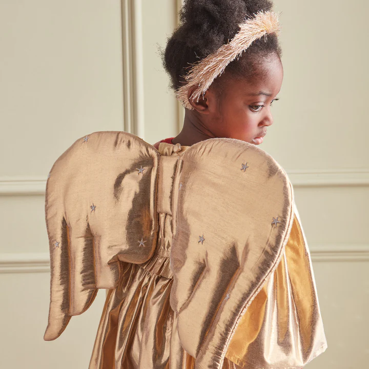 Dieses prächtige Engelsset eignet sich perfekt für Krippenspiele in der Schule, Partys oder fantasievollen Spaß. Die luxuriösen Flügel aus goldenem Lamé sind gepolstert und gesteppt und mit weißen gestickten Sternen verziert. Das Stirnband ist so gestaltet, dass es sich sanft um die Stirn schmiegt und so einen atemberaubenden Effekt erzielt. Die gepolsterten und gesteppten Flügel sind aus goldschimmerndem Lamé-Stoff gefertigt. Kleine weiße, gestickte Sterne sorgen für zusätzliche Details und Schönheit. Die Flügel haben elastische Samtbänder in Altrosa für angenehmen Tragekomfort. Das Stirnband besteht aus goldmetallischem Lametta-Stoff. Geeignet für Kinder im Alter von 3 bis 8 Jahren. Produktabmessungen : Spannweite - 53 cm