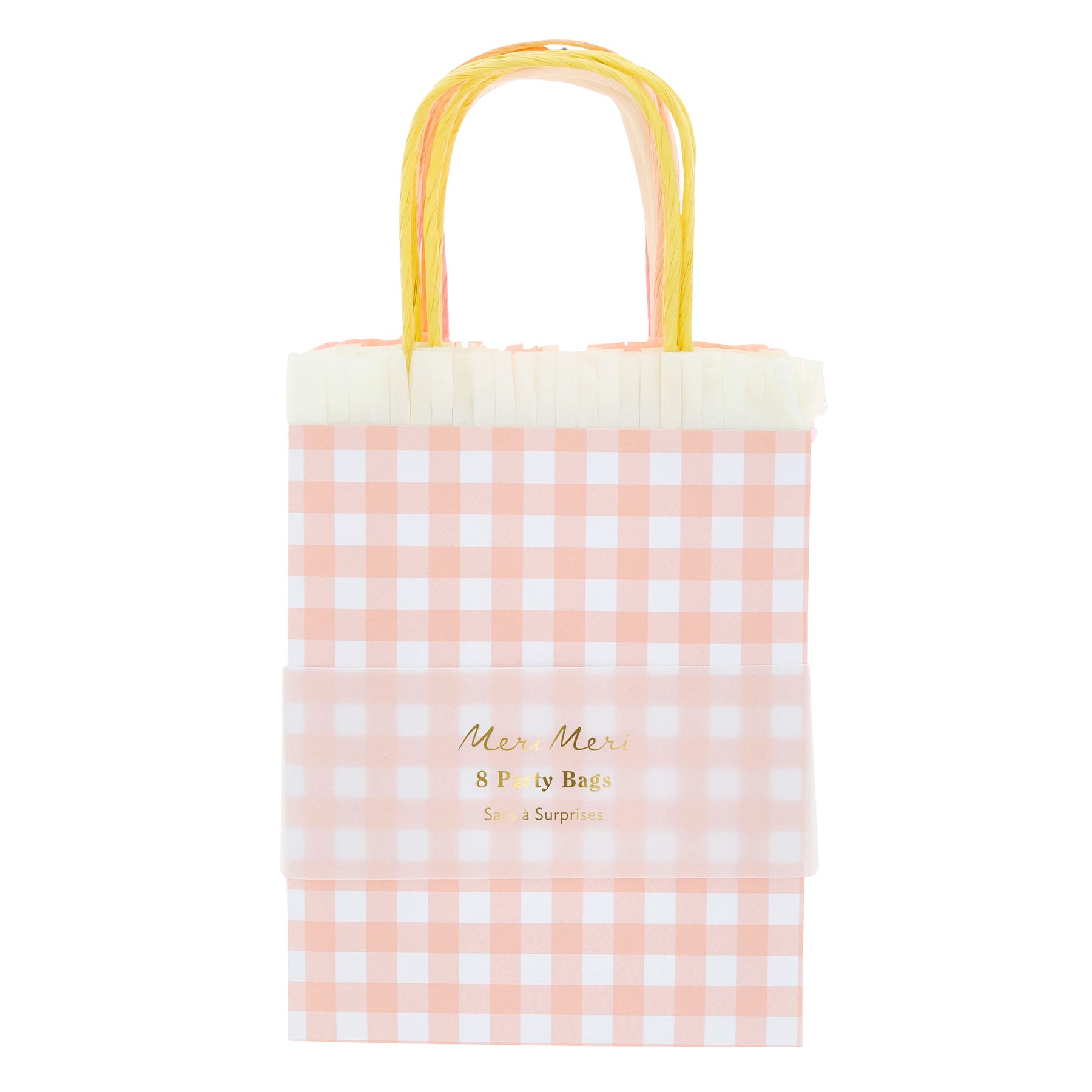 Gingham ist ein zeitlos-schönes, kariertes Muster, welches nie aus der Mode kommen wird. Diese Partytüten aus festem Papier sind in vier sommerlichen Ginghamtönen, jeweils mit Henkeln aus gedrehtem Papier in Komplementärfarben und verspielten Fransen aus Krepppapier für einen charmanten, mehrschichtigen Effekt. Sie eignen sich perfekt zum Befüllen mit Geschenken und Leckereien. 8 karierte Partytüten mit Fransen in vier verschiedenen Farben – Rosa, Gelb, Mint und Blau. Größe ca.: 15,2 x 12,7 cm (ohne Henkel)
