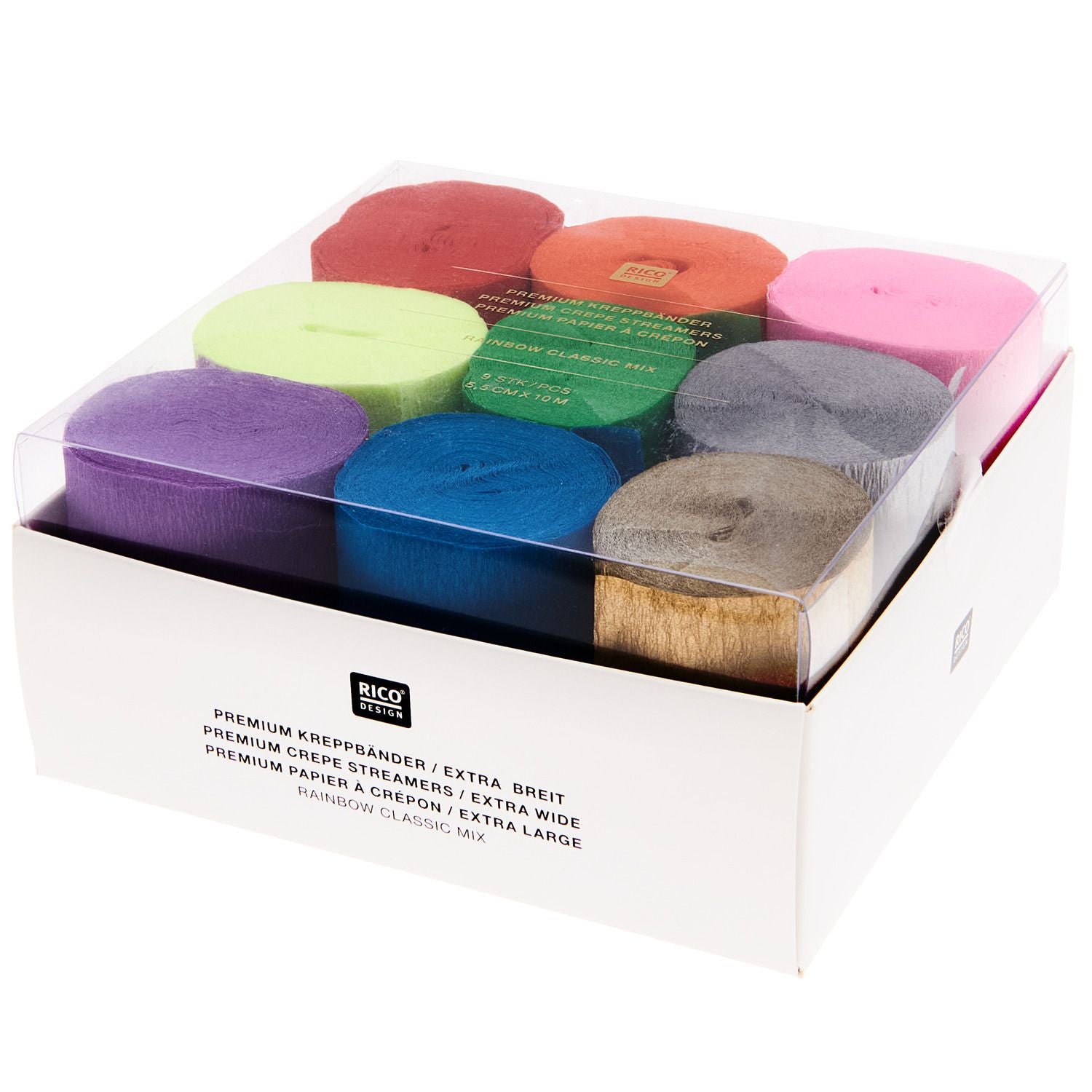 Diese kunterbunten Farben der Kreppbänder eignen sich hervorragend zur Dekoration von Räumen oder können als hübsche Verschönerung eurer nächsten Geburtstagsparty verwendet werden. Mit diesem Krepppapier bringt ihr stilvolle Farben in eure Partydekoration. Maße je Rolle: 5,5cmx10m. Inhalt: 9 Stück