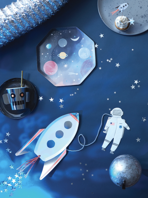 16 Servietten in Form eines Astronauten im tollen Astronautenanzug mit silber, glänzenden Details.