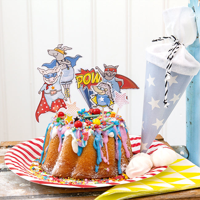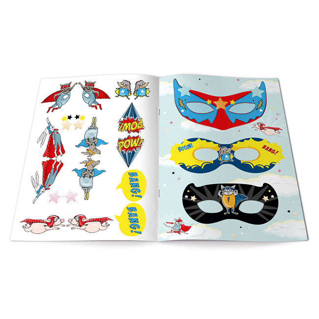 Im Buch enthalten sind 6 Superheldenmasken, 11 Trinkhalmtopper, 6 Armbänder und 18 Stecker zum Dekorieren von Geschenken, Kuchen oder Muffins.
