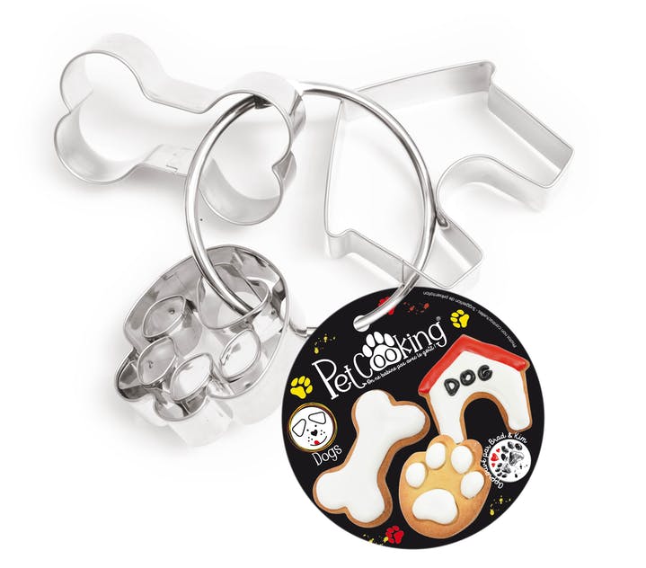 3 tolle Ausstechformen in Form eines Knochens, einer Hundehütte und einer Pfote.