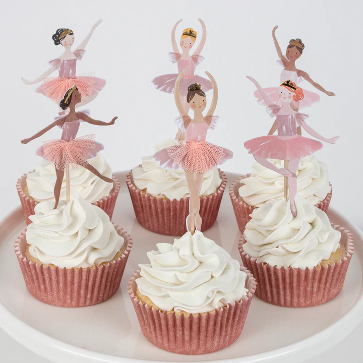 Ein bezauberndes Cupcake Set mit 24 Förmchen und 24 Pickern, in Form von anmutig tanzenden Ballerinas mit goldenen Kronen und teils tüllbesetzten Röckchen.Verziert eure Muffins oder kleine Speisen mit diesen Pickern und verzaubert eure Gäste. Verpackt in einem rosenverzierten Karton und daher auch sehr gut als Geschenk geeignet.