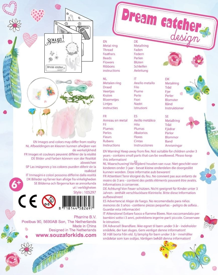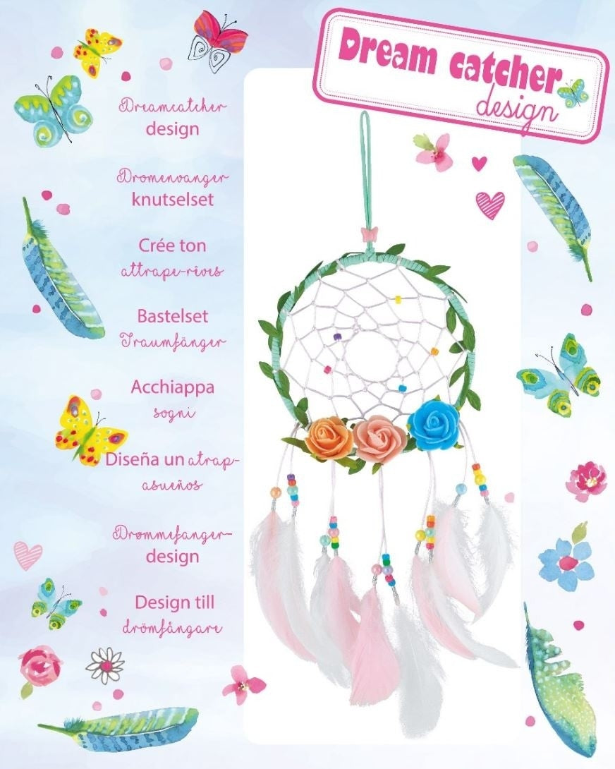 Bastel dir einen Traumfänger, hänge ihn ins Fenster und verscheuche die bösen Träume. Wunderschöne Accessoires wie z.B. Perlen, Federn und Blüten sind in diesem Set enthalten.
