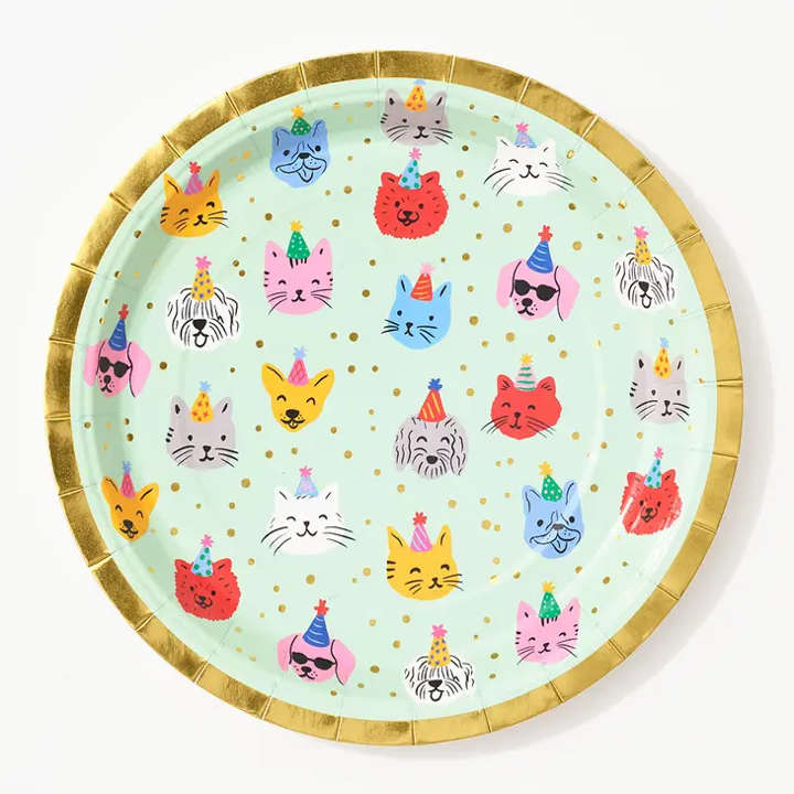 Coole Hunde und Katzen, die durch ihre lustigen Hüte zeigen, dass sie in Partylaune sind! 10 goldumrandete Pappteller mit vielen verschiedenen Hunden und Katzen.