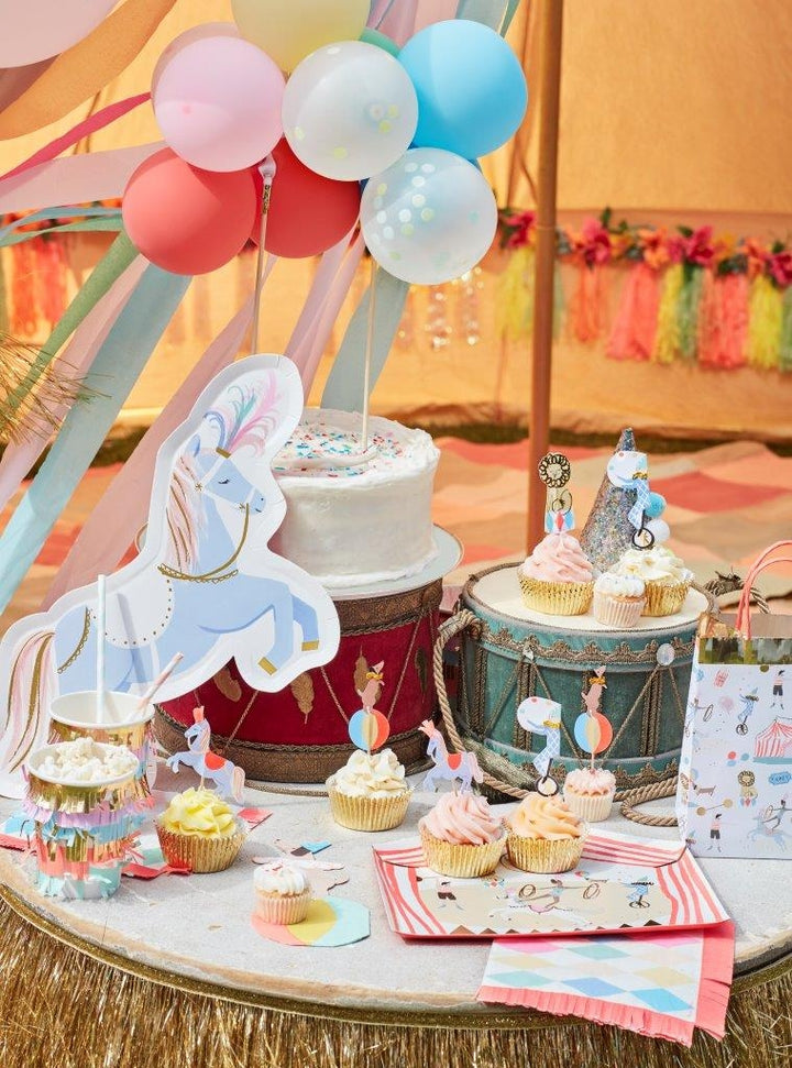 Pappteller in Form eines festlich geschmückten Zirkuspferdes mit Goldfoliendetails.