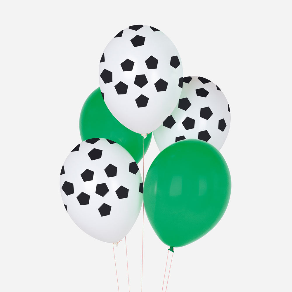 Weiße und grüne Ballons, bedruckt mit einem Fussballmuster und coolen Fussballern.