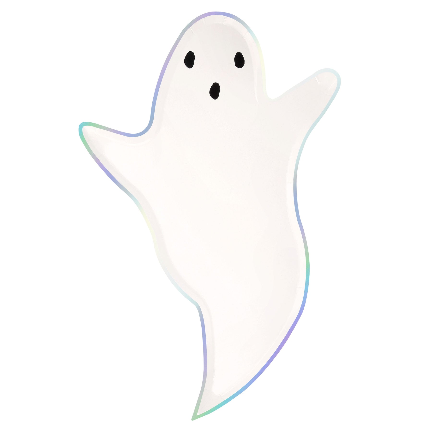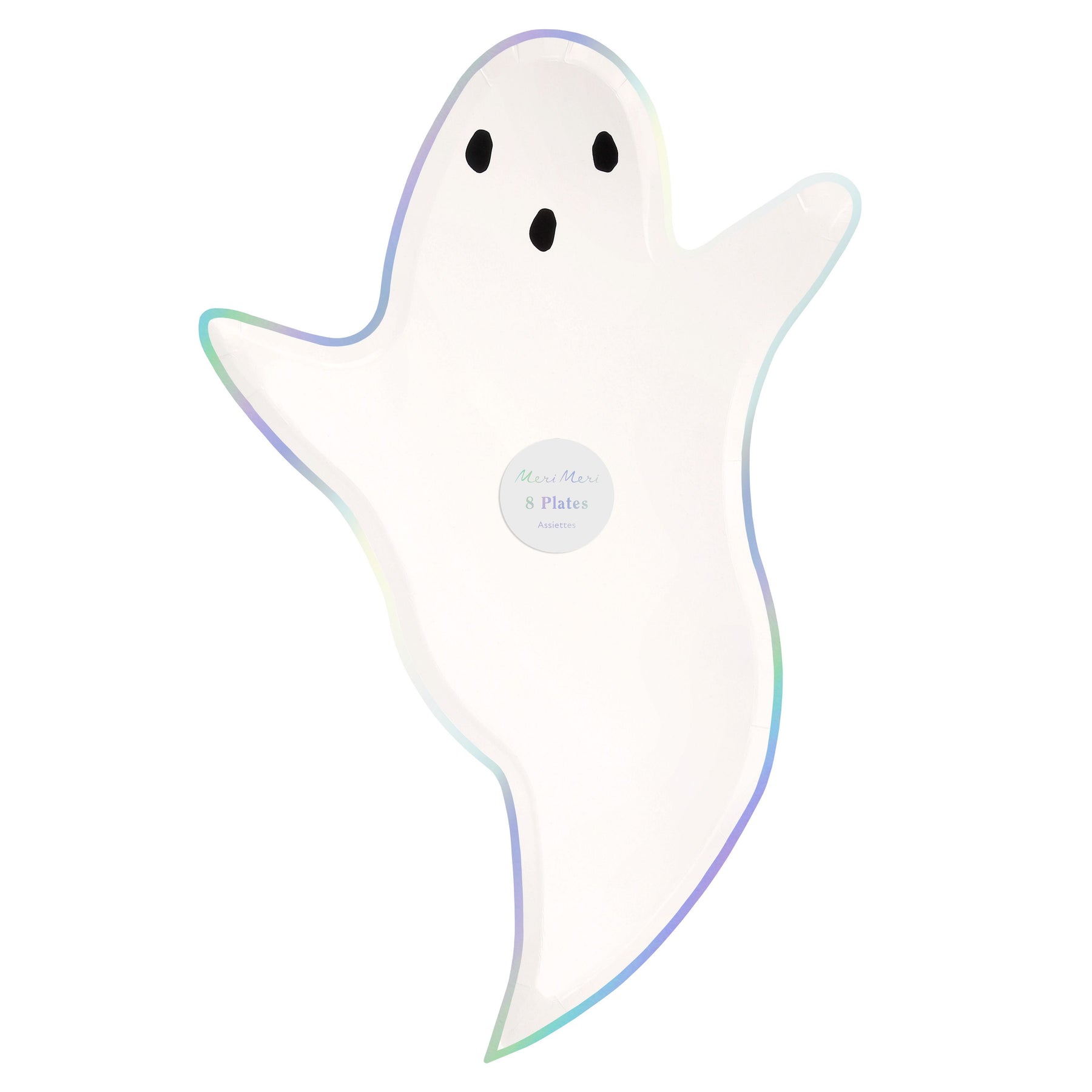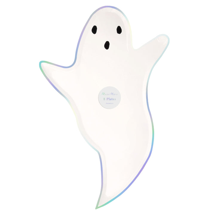 Boo! Dekoriert eure Halloweenparty mit diesen 8 geisterförmigen Papptellern. Entworfen mit einer klassischen, schwebenden Ghost -Silhouette und einem schillernden Silberfolienrandt. Perfekt für gruselige Halloweenpartys! Größe ca. 34 x 23 cm.