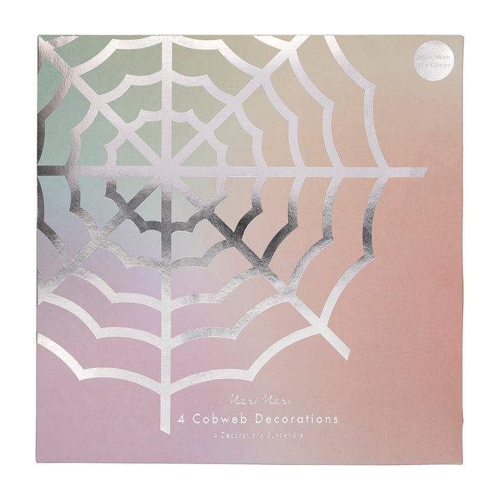 4 Spinnennetze aus folierter Pappe und 8 glitzerne Spinnen machen deinen Partyraum extrem gruselig. Hängt die Spinnen in die Netze und los geht die gruselige Party.