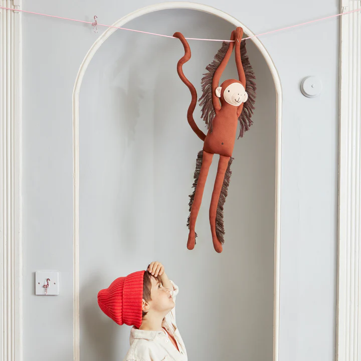 Lustiger, liebevoll genähter Affe aus kuscheliger Bio-Baumwolle. Die Arme können per Klett zusammengemacht werden und fein gearbeitete Details runden die Optik ab. Dieses Äffchen könnt ihr wunderbar umarmen und es wird ein freundlicher Begleiter für jeden Fan der Wildtiere. Größe ca. 71 x 25 cm.