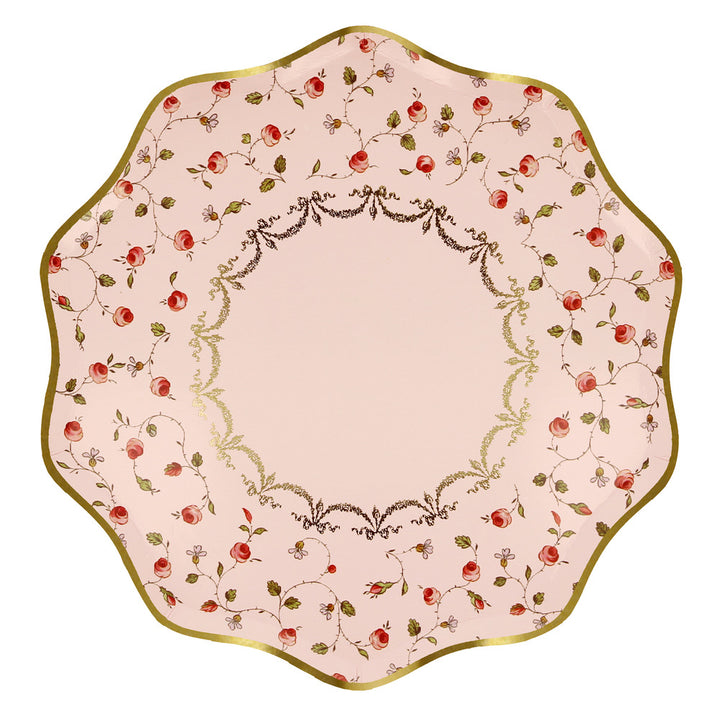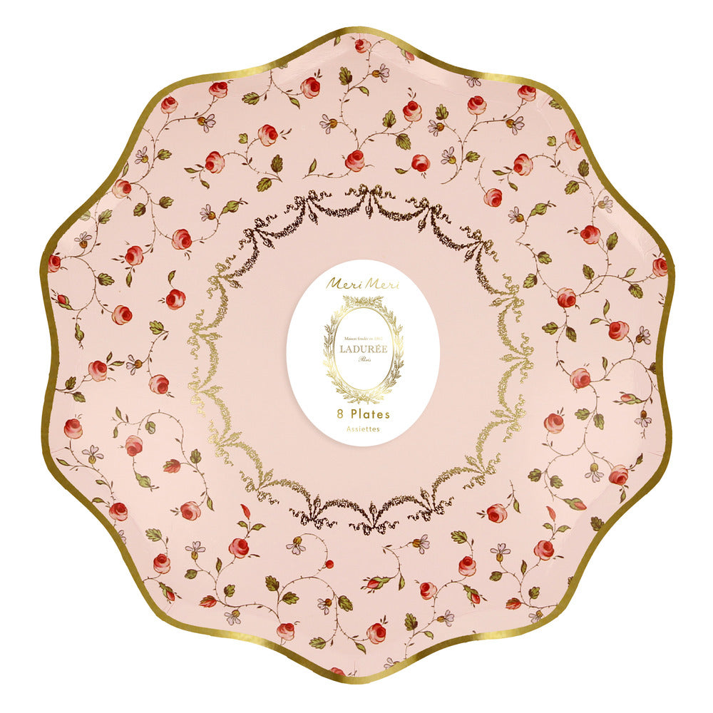 Eine Variante der wunderschönen Laduree Kollektion sind diese rosafarbenen Blumenteller mit goldenem Wellenrand und goldener Innengirlande. Zart rankende Blumen zieren den Großteil der Teller.