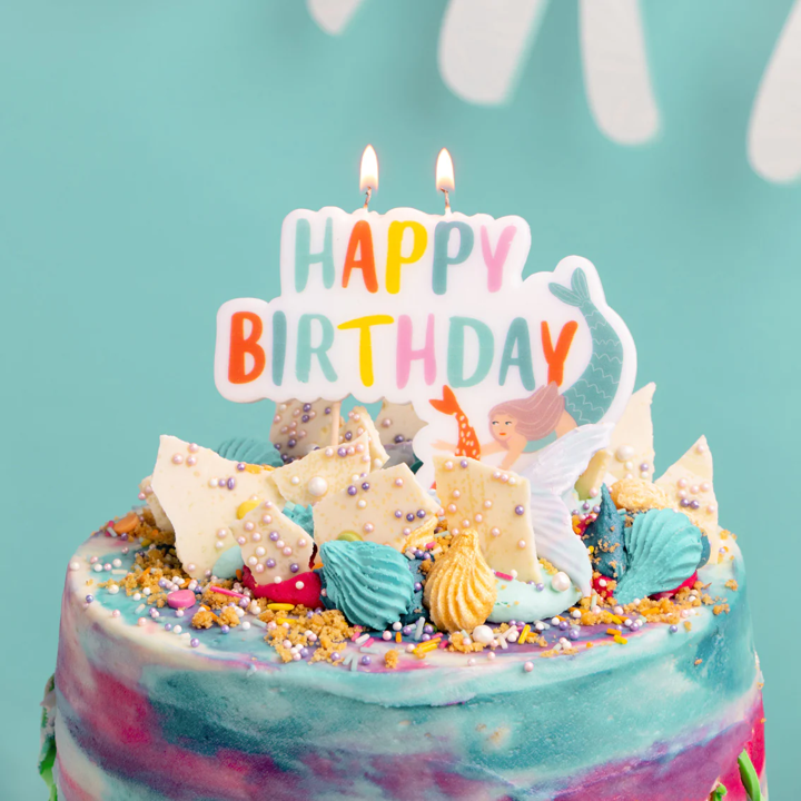 Eine anmutige Meerjungfrau ziert diese Happy Birthday Kerze. Genau das Richtige für die Meerjungfrauenparty oder den Fan der Wunderwesen des Meeres.
