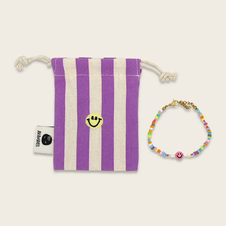 Dieses hübsche Kinder-Armband ist ein echter Hingucker. Die vielen bunten Perlen sorgen für immer gute Laune und machen das Bändchen zum begehrten Tauschobjekt mit der Klassenkameradin und besten Freundin. Das mitgelieferte Baumwollsäckchen, bestickt mit einem lustigen Smile, passt perfekt zum Armband.