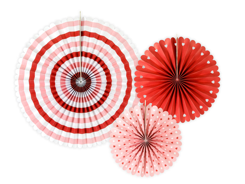 3 dekorative Rosetten in rot mit Herzen und Streifen. Durchmesser nach dem Zusammenbau ca. 21 cm, 25 cm und 38 cm.