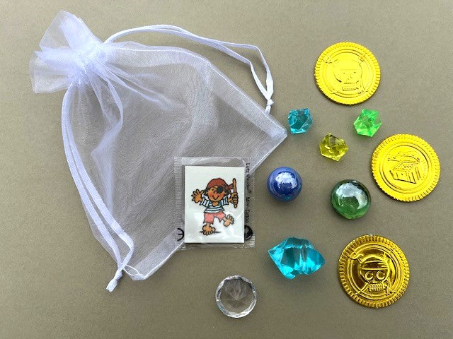 Ein Organzasäckchen gefüllt mit 11 kleinen Kinderschätzen. Enthalten sind ein Tattoo, 3 Piratenmünzen, 1 großer Kristall,, 3 kleine Kristalle, ein Diamant, ein Nugget und eine Murmel. Perfekt geeignet für eine Schatzsuche. Füllt die Säckchen in eine Schatzkiste und schon kann die Suche nach dem Schatz für die Piratenhorde beginnen.