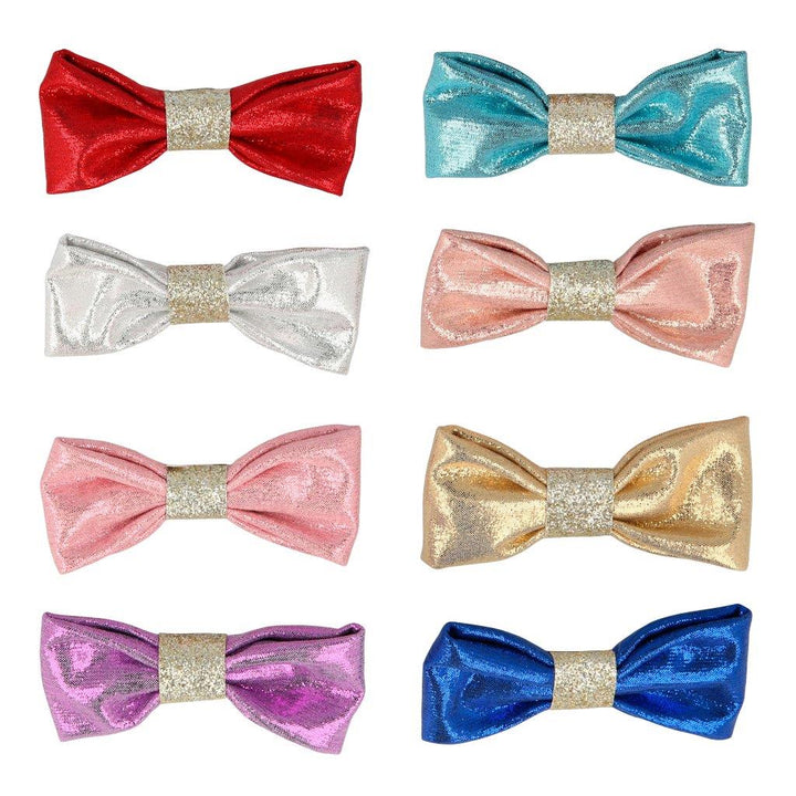 8 glitzerne Haarspangen in Form von verschiedenfarbigen Schleifen mit einem gold glitzernen Band in der Mitte sind der perfekte Haarschmuck für besondere, festliche Anlässe.