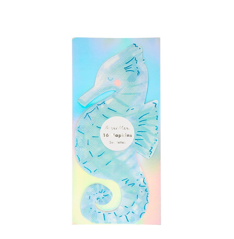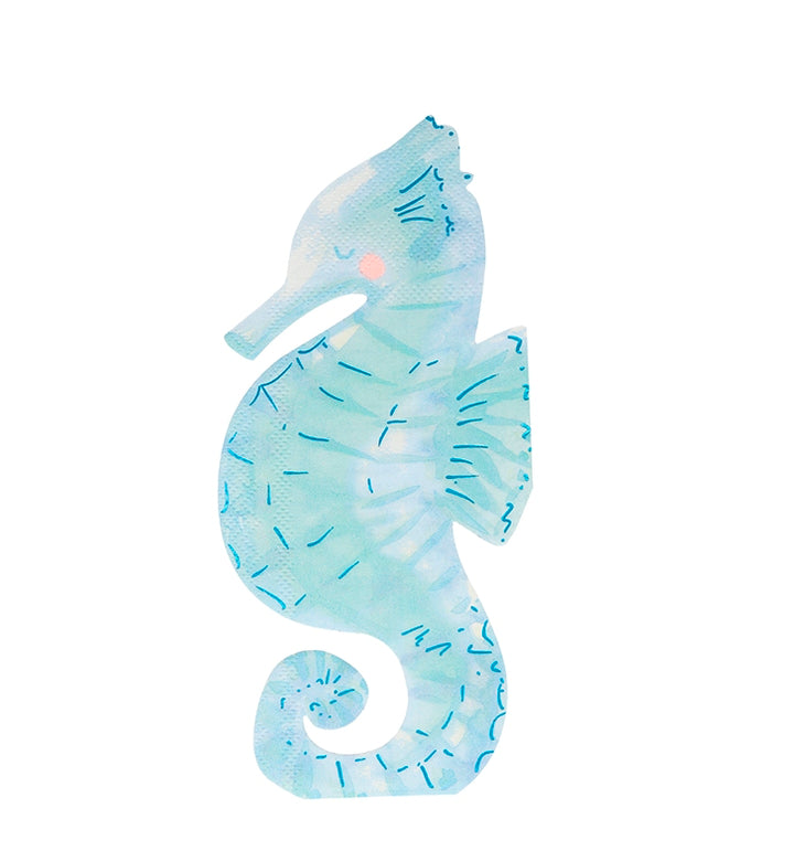 Wunderschöne Servietten in Form eines anmutigen Seepferdchens mit glänzenden Elementen aus der Mermaid Serie von Meri Meri! Packung enthält 16 Servietten. Größe der Serviette: ca. 19 cm.