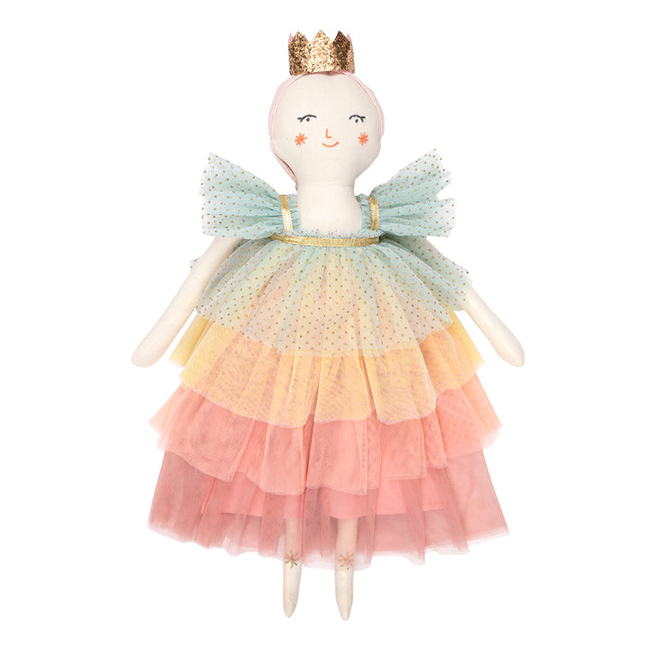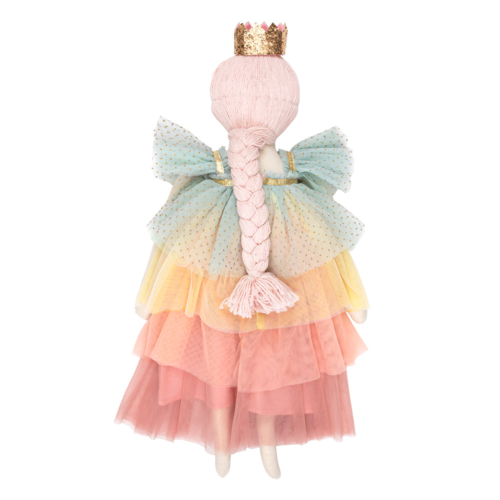 Diese schönen klassischen Stoffpuppen der Designermarke Meri Meri sind weich und anschmiegsam, aber dennoch robust genug, um mit ihnen zu spielen und Abenteuer zu erleben. Jede unserer Puppen hat ihren eigenen Namen und ihre eigene Identität. Das ist Prinzessin Gemma, gefertigt aus Kattun mit langem Wollhaar und süßen Stickereien. Sie trägt ein Regenbogenkleid mit Stufenoptik und eine glitzerne, goldene Krone. Sie kann leicht ausgezogen und in jedem unserer Kleidungsstücke wieder eingekleidet werden. Aufwendig gearbeitet und zeitlos schön! Größe ca. 50cm.