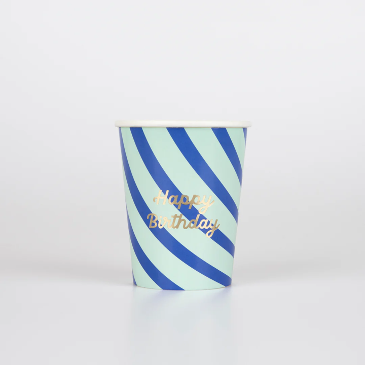 Alles Gute zum Geburtstag, nur sensationelle Streifen reichen aus! Dieses trendige, fröhlich, gestreifte Set verleiht deiner Party mit Sicherheit einen Hauch von Farbe und zaubert jedem ein Lächeln ins Gesicht. Neben den wichtigsten Partyutensilien wie Tellern, Bechern und Servietten sind auch ein Cupcake-Set, Partyhüte mit lustigen Wabendetails und eine Mini-Girlande enthalten. Eine Party in einer Box! Inhalt: 1 Mini Fan Girlande, 1 x Stripe Happy Birthday Teller (8er-Pack), 1 x Stripe Happy Birthday Servietten (16er-Pack), 1 x Stripe Happy Birthday Becher (8er-Pack), 1 x Stripe Party Cupcake-Set (mit 24 Toppern und 24 Cupcake-Förmchen), 1 x Stripe Partyhüte ( 8 Stück).