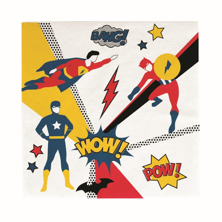 Servietten für wahre Superhelden! Coole Comicausrufe, Blitze, Fledermäuse, Superhelden und andere Comicsymbole sind auf diesen Servietten verstreut.